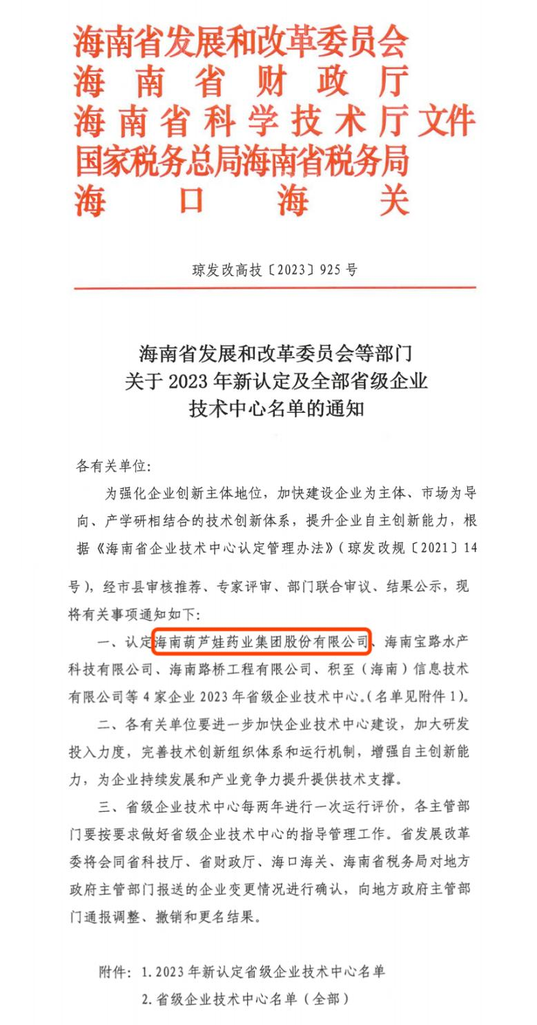 近日,海南省发改委等多部门联合公布了《关于2023年新认定及全部省级企业技术中心名单的通知》,其中,海南AG刮刮卡药业集团股份有限公司成功通过评审,被认定为省级企业技术中心,是本次获批的4家企业之一。